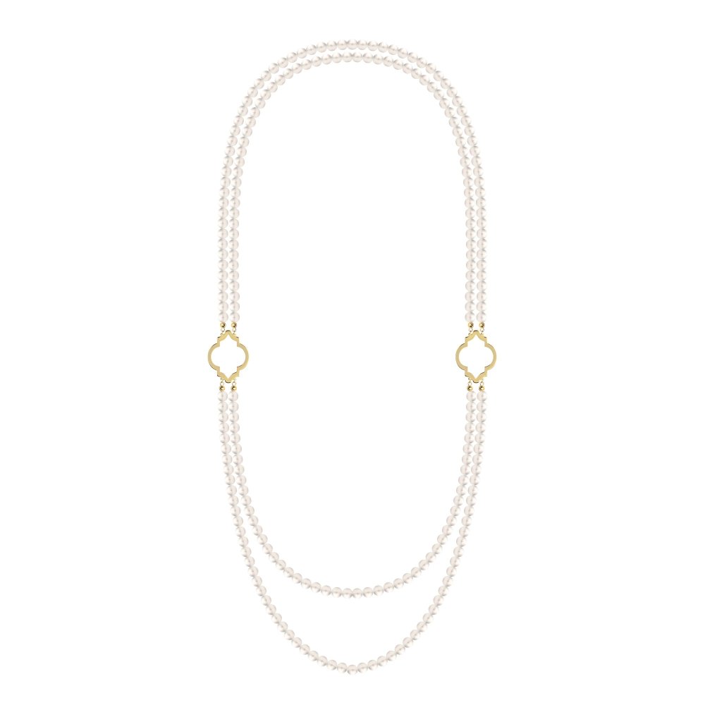 Of supreme elegance, inspired by oriental sensuality through the blend of gold, pearls, and the central symbol of the Marrakesh signature collection, the Amina double necklace in 14 KT yellow gold brings a touch of versatility. It can be worn in multiple ways, highlighting the harmony of the female body.