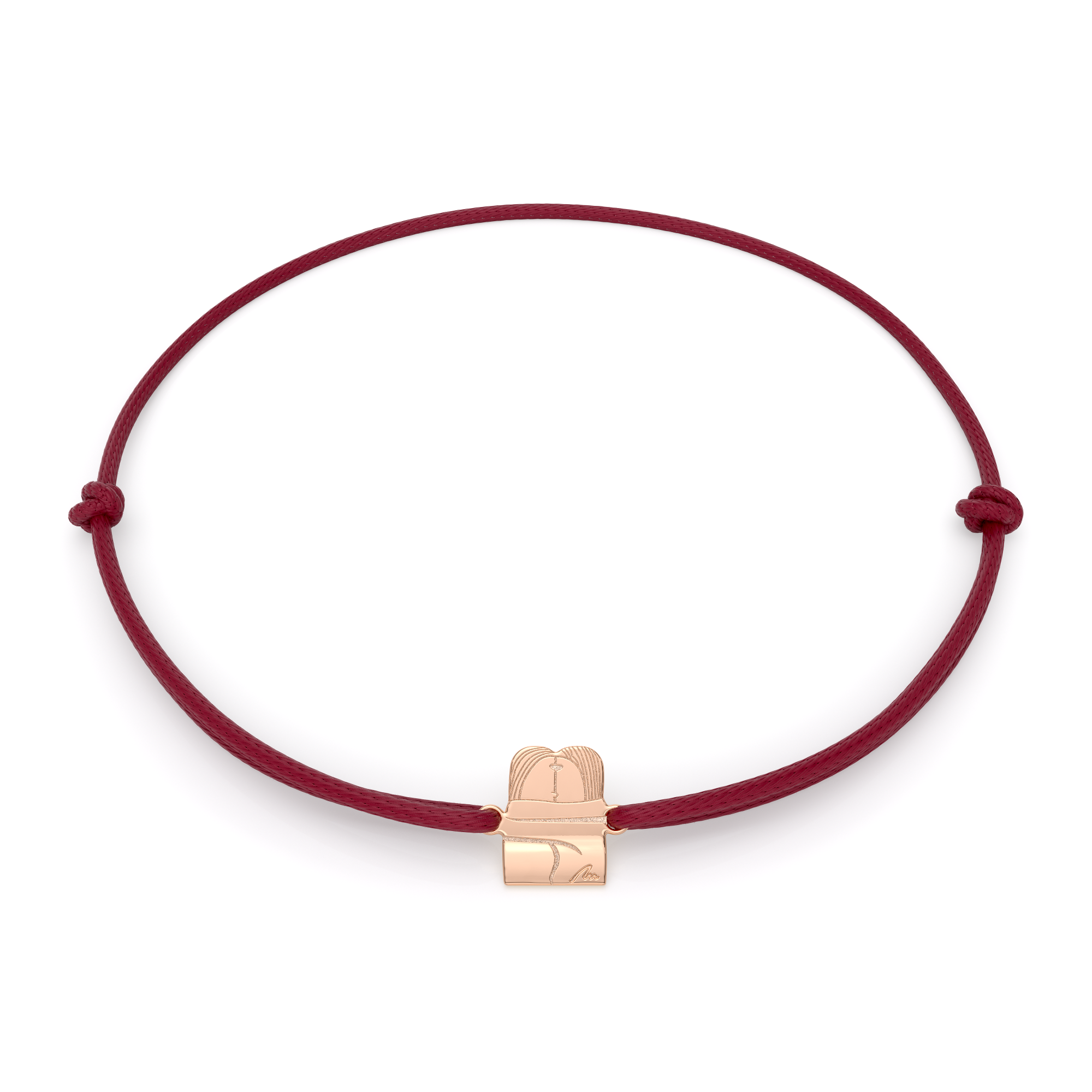 The red string bracelet with The Kiss pendant in 14 KT rose gold is a celebration of eternal love and the deep bond between two souls, inspired by the work of Constantin Brancusi. Representing the perfect union of love, it evokes a connection that transcends time and space. The Kiss jewellery piece is an expression of passion, harmony, and the promise to remain together beyond all boundaries.