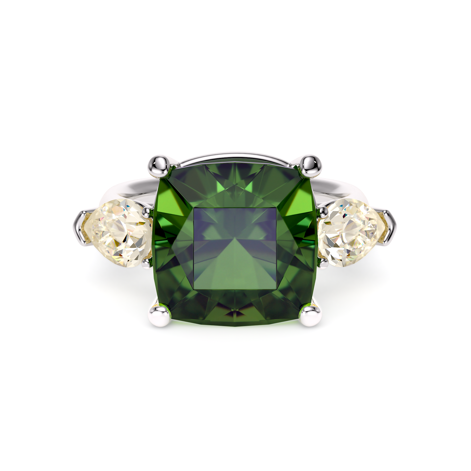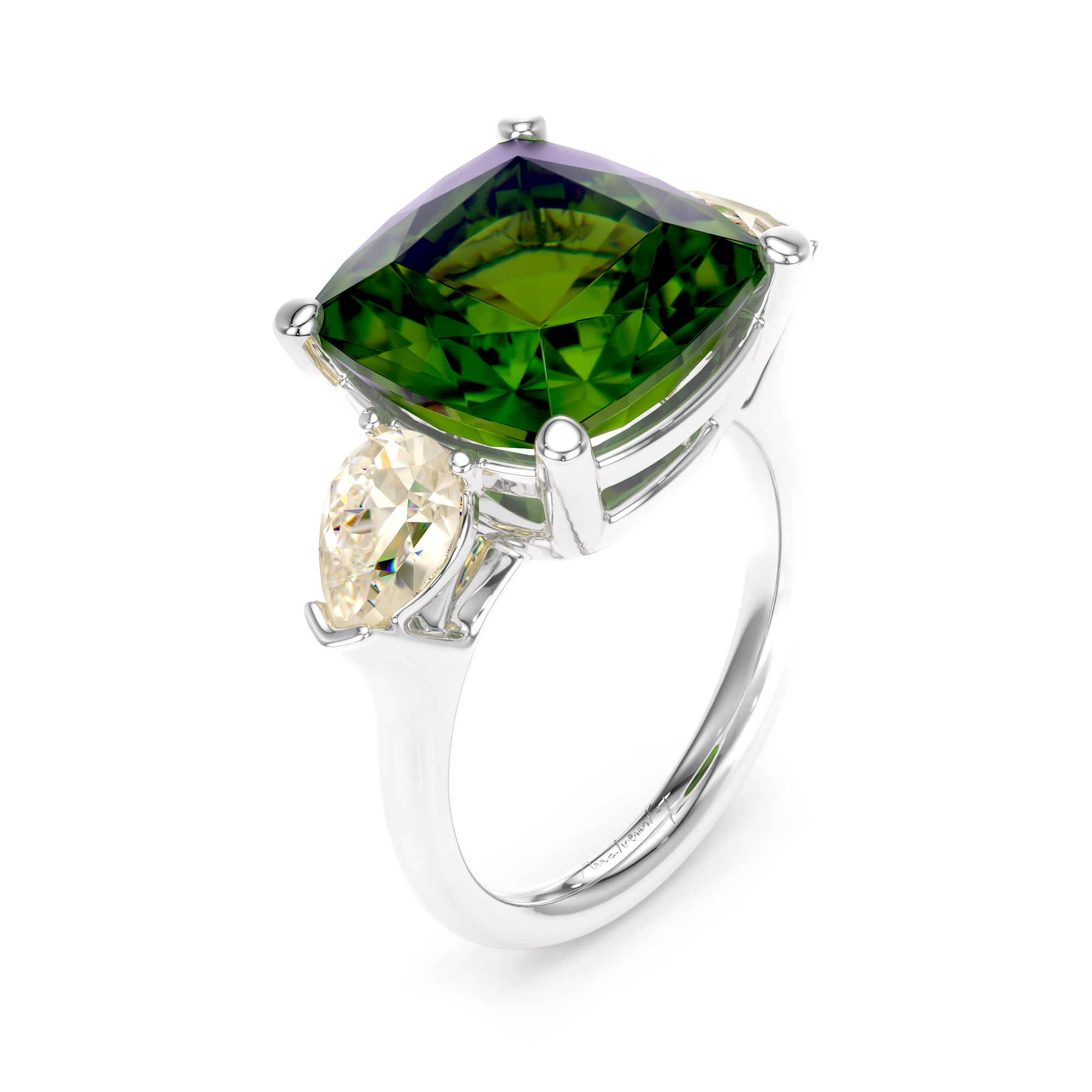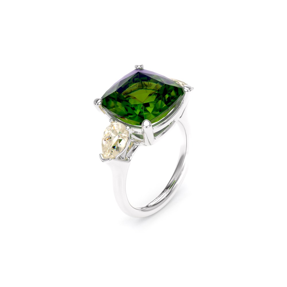 Saint-Tropez La Grande Bellezza ring, in 18 KT white gold, with 11.39 CT (aprox 12x12 mm) tourmaline and 1.14 CT fancy yellow lab grown diamonds (aprox 4.3x6.5 mm)