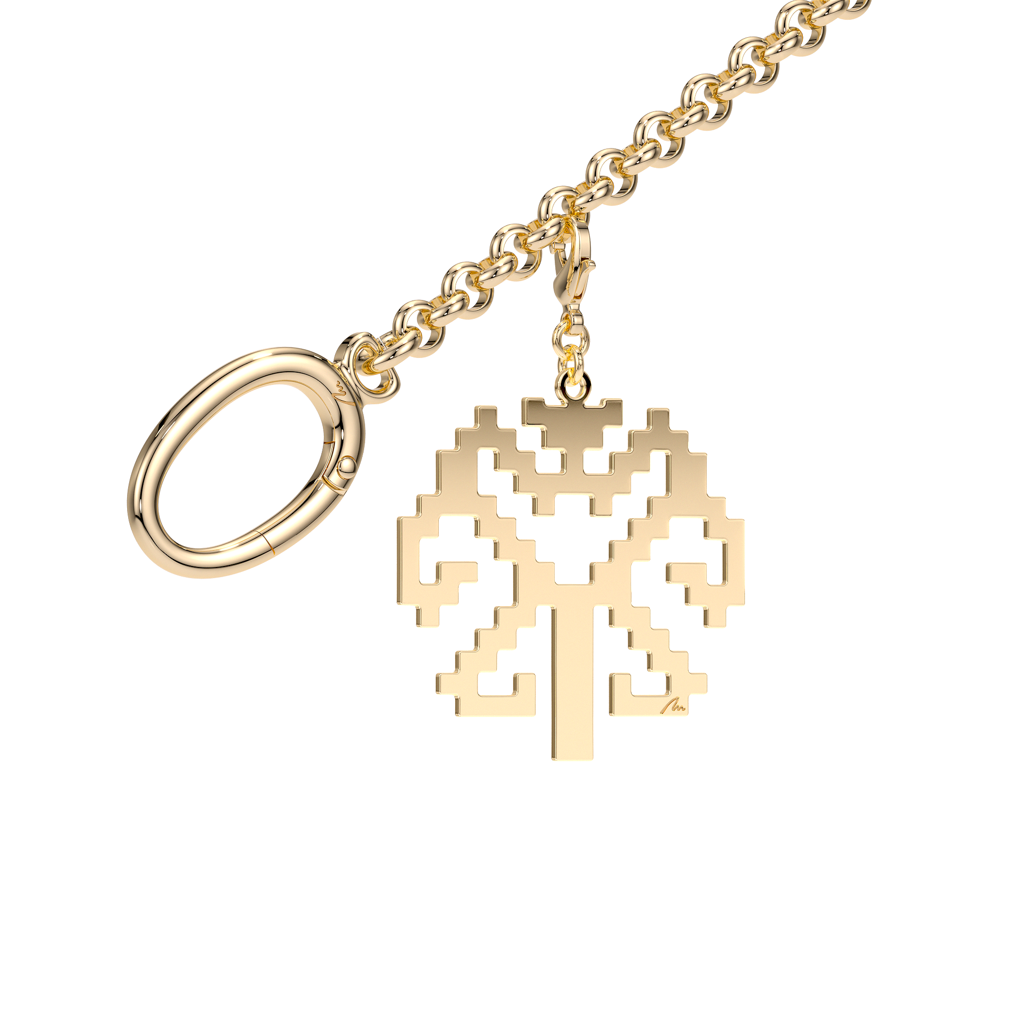 Charmul pentru geanta Copacul Vietii, din alama placata cu aur galben, este unul dintre cele mai vechi simboluri traditionale romanesti, inspirat din natura infinita a existentei. Reprezinta forta, intelepciunea si continuitatea, fiind un semn al legaturii dintre generatii si al protectiei divine.