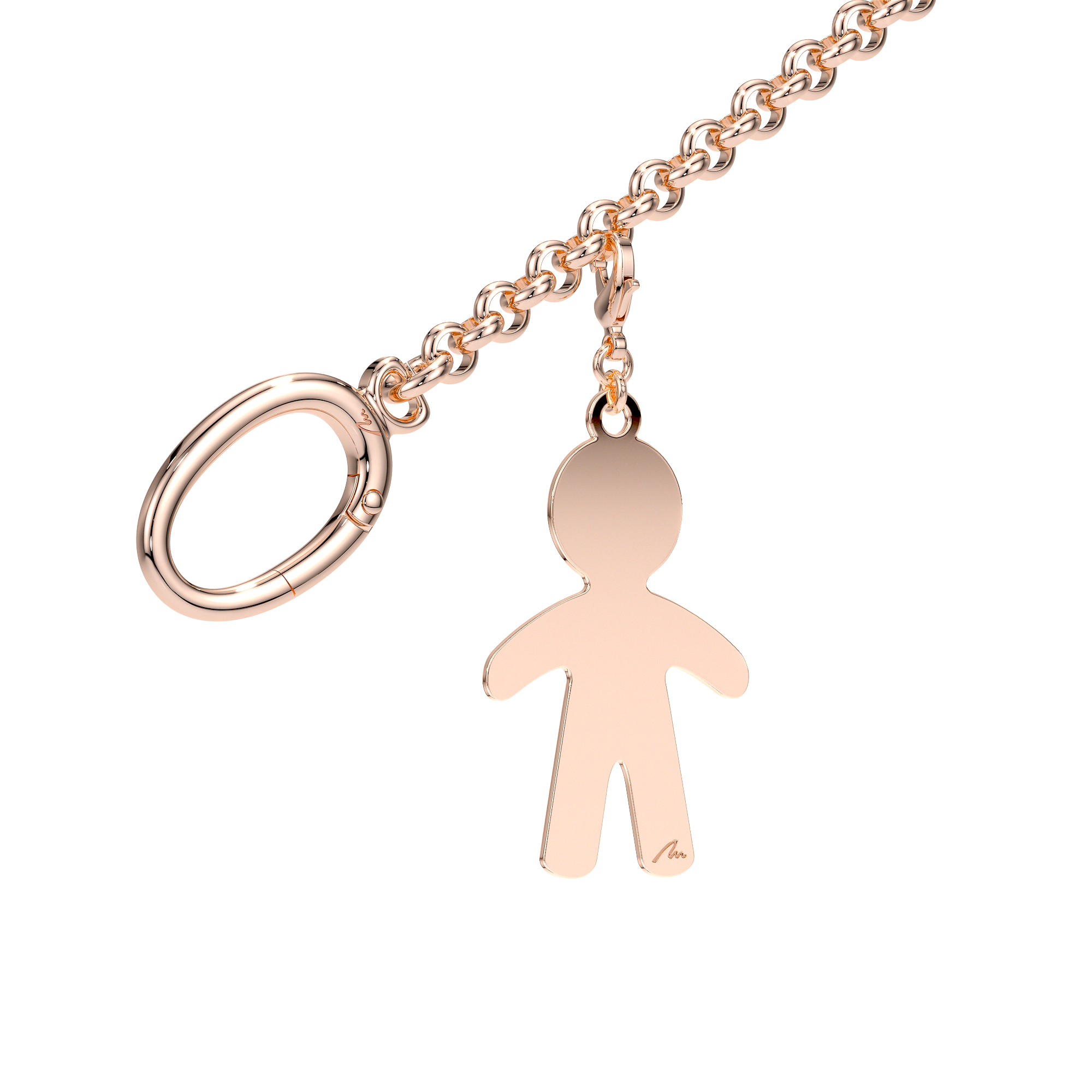 Charmul pentru geanta Baiat, din alama placata cu aur roz, este un simbol al puritatii, al curajului si al inocentei. Evoca energia tineretii si bucuria descoperirii lumii, amintind de spiritul liber si jucaus al copilariei. O bijuterie delicata, ce poarta in ea emotia primelor vise si puterea inceputurilor.