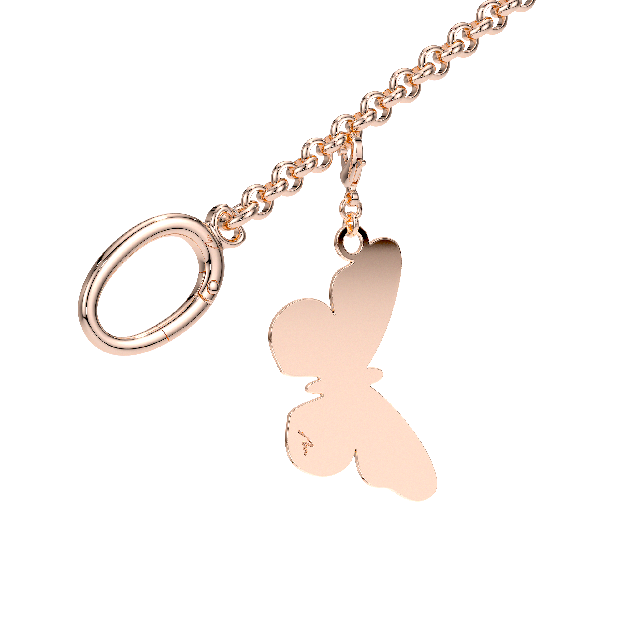 Acest charm pentru geanta din alama placata cu aur roz este un simbol al frumusetii si al schimbarii, un detaliu rafinat pentru cei care cred in puterea viselor si a evolutiei continue.
